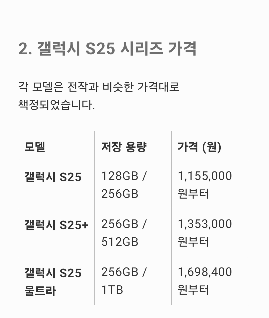 2. 갤럭시 S25 시리즈 모델 및 가격