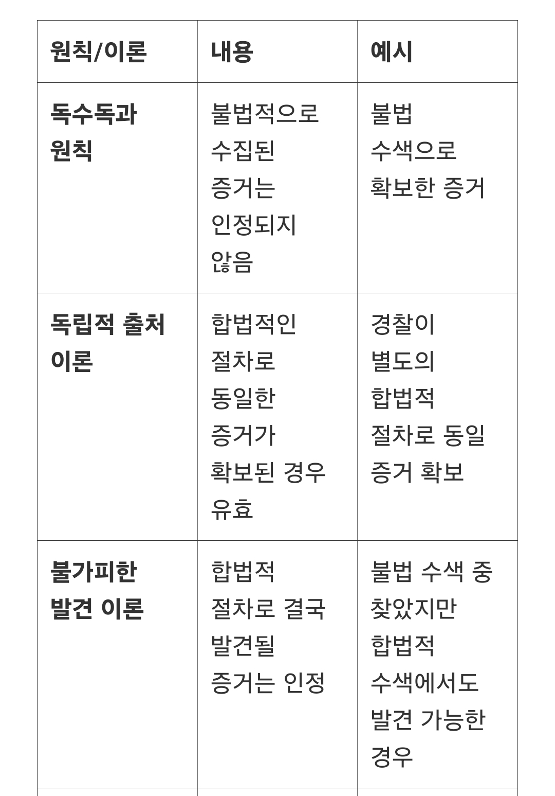 예시: 불법 수색 중 발견된 범죄 도구가 있었다 해도, 해당 도구가 합법적인 수색에서 별도로 발견되었다면 증거로 사용할 수 있습니다.