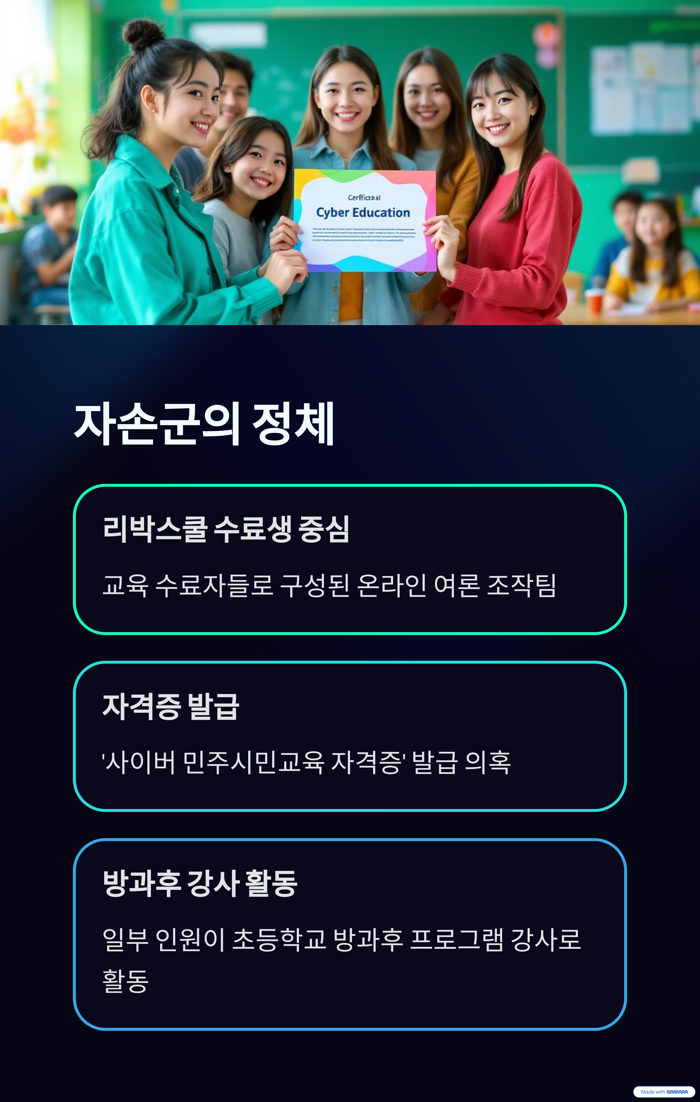 ‘자손군’은 리박스쿨 내부에서 활동하는 온라인 여론 조작팀으로, 구성원은 리박스쿨 교육을 수료한 인물들이 중심이 되었다는 의혹이 제기됐습니다. 일부 인원은 리박스쿨로부터 ‘사이버 민주시민교육 자격증’을 발급받고, 이후 방과 후 프로그램 강사로 활동한 정황도 포착되었습니다.