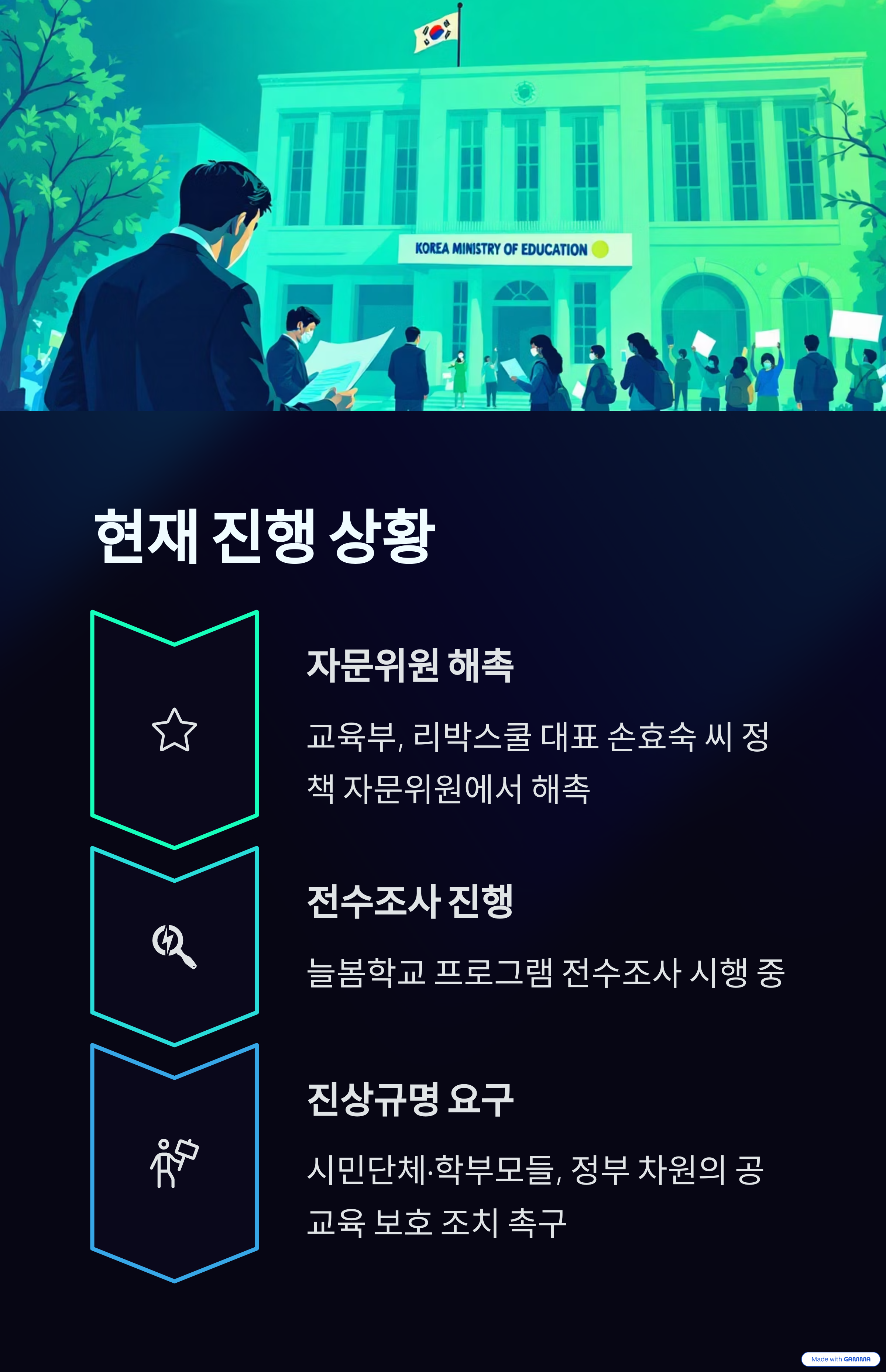 교육부는 리박스쿨 대표 손효숙 씨를 정책 자문위원에서 해촉했으며, 리박스쿨 강사들이 참여한 늘봄학교 프로그램에 대한 전수조사를 시행 중입니다. 시민단체와 학부모들은 이번 사건의 진상 규명을 요구하며 정부 차원의 공교육 보호 조치를 촉구하고 있습니다.