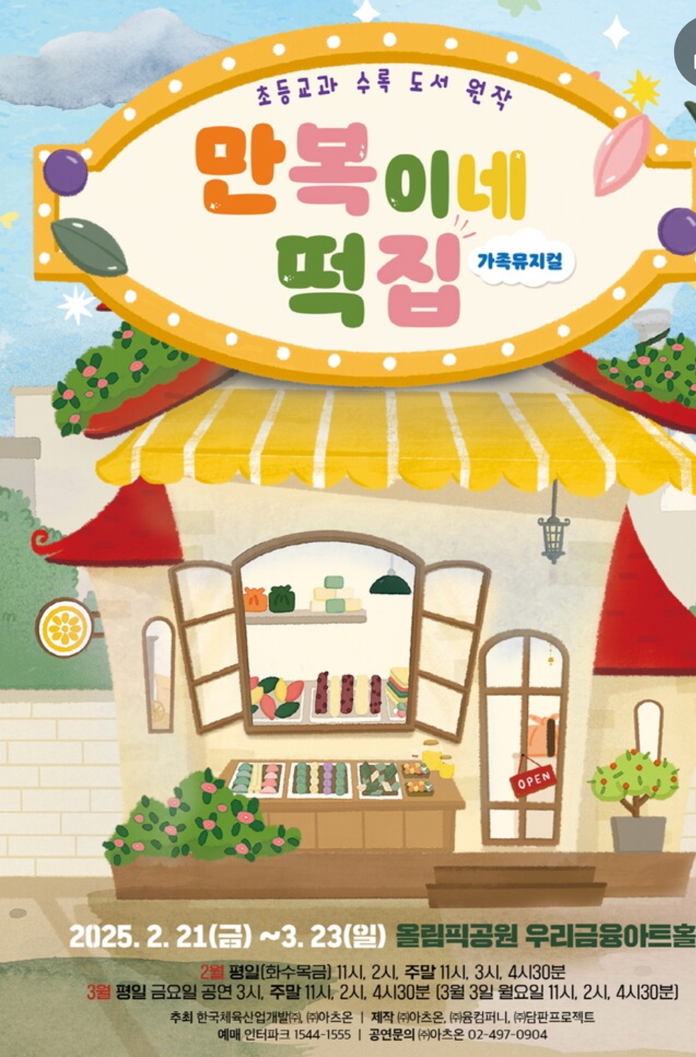 뮤지컬 만복이네 떡집은 서울 올림픽공원 우리금융아트홀에서 2025년 2월 21일부터 3월 23일까지 공연되며, 인터파크 티켓, YES24 티켓 등을 통해 예매 가능합니다.