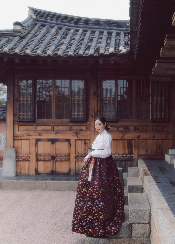 민효린은 흰색 저고리에 짙은 보라색 치마를 매치하고 화려한 꽃무늬 디테일을 더해 전통미를 더욱 돋보이게 했습니다. 깔끔하게 올려 묶은 머리와 정교한 전통 머리장식은 그녀의 세련된 이미지와 잘 어우러지며 고풍스러운 아름다움을 배가시켰습니다. 특히, 한옥을 배경으로 자연스러운 포즈를 취한 그녀의 모습은 마치 한복 화보를 연상시키며 전통 문화의 품격을 높였다는 평가를 받고 있습니다.