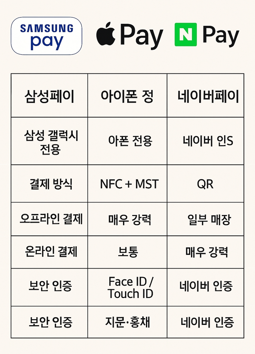 삼성페이는 오프라인 중심 소비가 많은 갤럭시 사용자에게 최적이고, 애플페이는 아이폰 사용자 중 해외 결제까지 고려하는 분께 추천됩니다. 반면, 네이버페이는 온라인 쇼핑과 네이버 생태계를 적극 활용하는 사용자에게 매우 유리합니다.