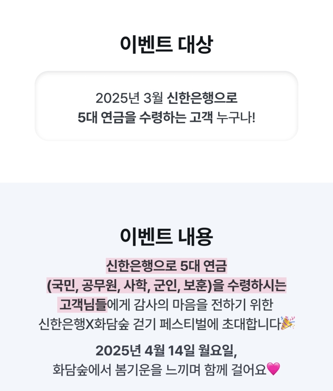 **‘화담숲에서 걸어봄’**은 신한은행이 5대 연금(국민연금, 공무원연금, 사학연금, 군인연금, 보훈연금) 수급 고객을 대상으로 진행하는 특별 걷기 이벤트입니다. 벚꽃이 만개하는 시기에 맞춰 3,000명의 고객을 초청하여 자연 속에서 힐링할 수 있는 기회를 제공합니다.