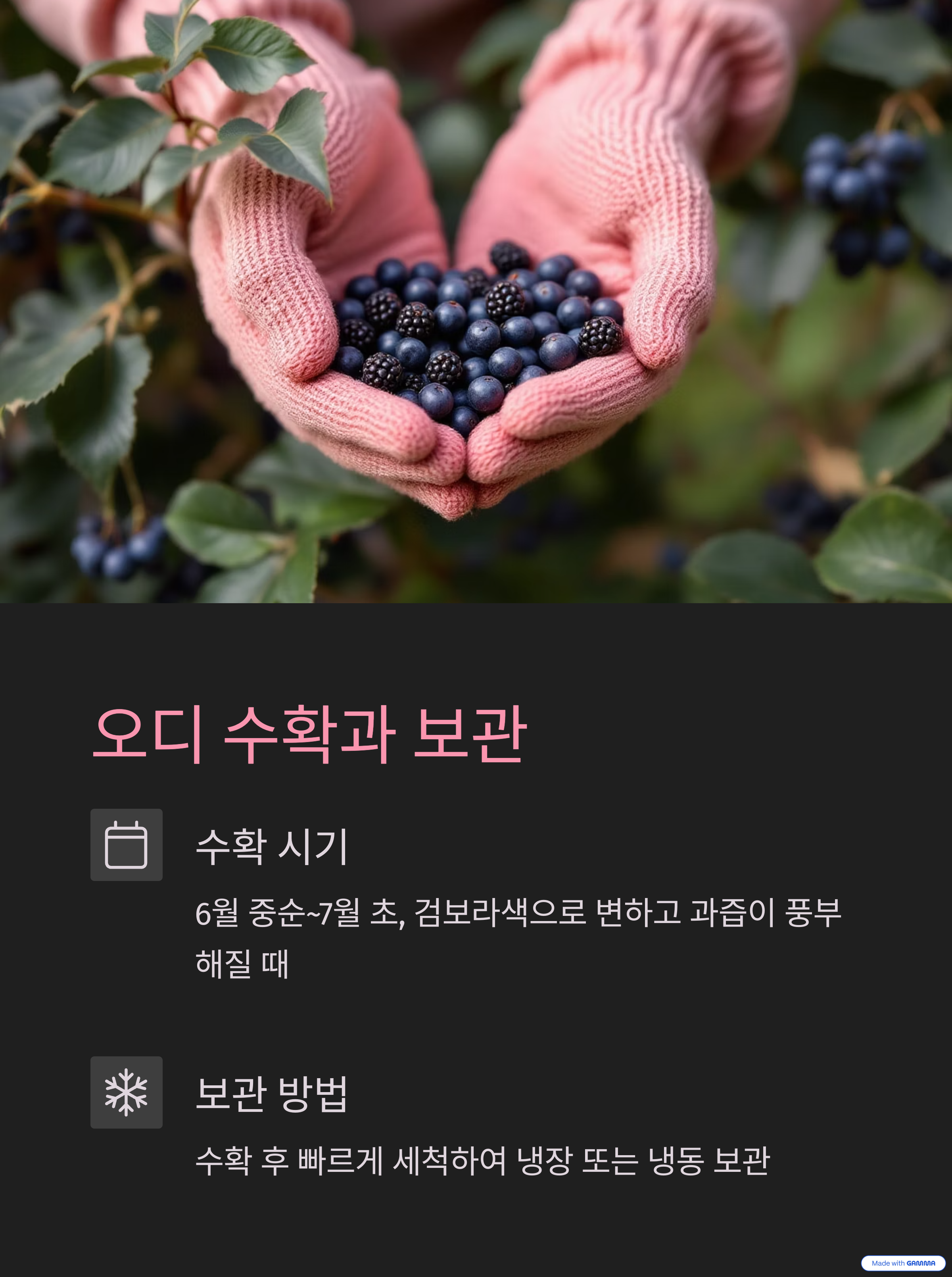 완전히 익으면 검보라색 또는 검정색으로 변하고 과즙이 풍부해지며, 너무 익기 전의 탄력 있는 상태가 수확 시기로 적합합니다. 수확 후에는 빠르게 세척한 뒤 냉장 또는 냉동 보관하면 신선도를 오래 유지할 수 있습니다.