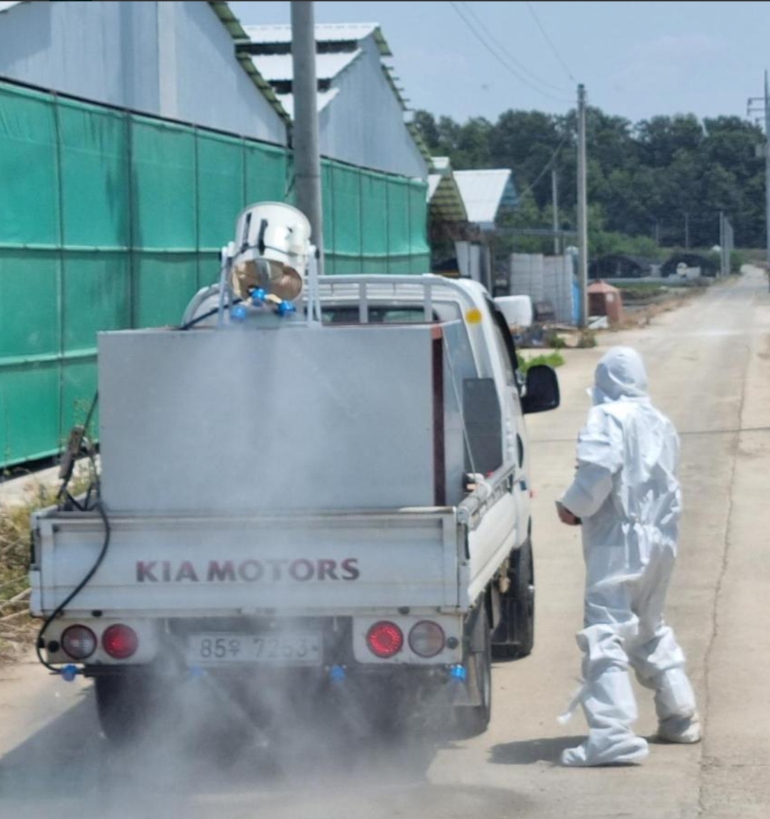 축협 공동방제단과 협력하여 농가 및 축사 주변 집중 소독을 강화하고 있습니다.