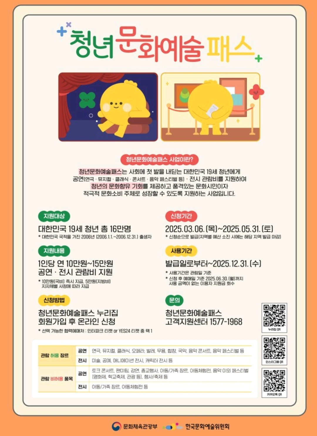 지원 대상자는 19세 청년(2006년생)이며, 연극, 뮤지컬, 클래식, 콘서트, 음악 페스티벌, 미술 전시, 박물관 전시 등 폭넓은 문화 예술 콘텐츠를 자유롭게 즐길 수 있습니다.
